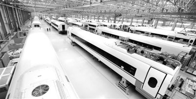 這是中國(guó)北車長(zhǎng)客股份公司裝配車間內(nèi)待組裝的用于京滬高鐵線的CRH380BL新一代高速動(dòng)車組(2011611日攝)。 新華社記者 王昊飛攝